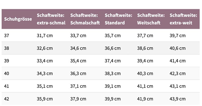 Sollte Ihre Schuhgröße derzeit nicht verfügbar sein, benachrichtigen wir Sie gerne per Email sobald die nachgefertigten Paare bei uns in Deutschland im Lager angekommen sind. Bitte senden Sie und dazu eine Email mit der Angabe des Modellnamens, Ihrer Schuhgröße und Wadenweite (gemessen mit Hose).